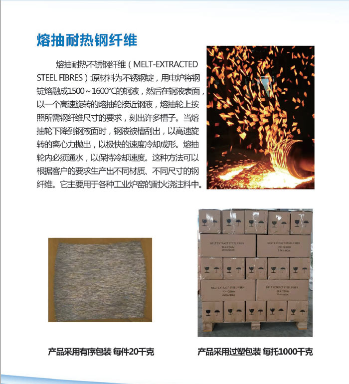熔抽耐熱不銹鋼纖維(MELT-EXTRACTEDSTEELFIBRES):原材料為不銹鋼錠,用電爐將鋼錠熔融成1500~1600℃的鋼液,然后在鋼液表面,以一個高速旋轉(zhuǎn)的熔抽輪接近鋼液,熔抽輪上按照所需鋼纖維尺寸的要求,刻出許多槽子。當(dāng)熔抽輪下降到鋼液面時,鋼液被槽刮出,以高速旋轉(zhuǎn)的離心力拋出,以極快的速度冷卻成形。熔抽輪內(nèi)需要通水,以保持冷卻速度。這種方法可以根據(jù)客戶的要求生產(chǎn)出不同材質(zhì)、不同尺寸的鋼纖維。
